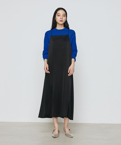 《デザイン》光沢の美しいサテンを贅沢に使用したクラス感溢れるキャミソールドレスです。レイヤードアイテムとしてもはや定番であるエッセンシャルなキャミドレを大人っぽい上質素材でお届けします。360°美シルエットでたっぷりとフレア分量を展開し、女性らしいフェミニンなシルエットです。体のラインを拾わないAラインが嬉しい、後ろ中心を吊ったようなドレ―プデザインがシンプルモードなワンポイントです。共布で仕立てる3.5ミリ幅の極細スパゲティストラップが女性らしいです。手間と技術を要する共地のスパゲティストラップです。後ろに調節可能なアジャスター付きでお好みの長さで調節して着られます。同月展開の七分袖Tシャツ(商品番号:01-01EK01-205)とコーディネートして頂けるように着丈や身幅を設定しています。是非、レイヤードしてお楽しみください。《素材》シルクのような肌触りとしわ加工によるナチュラルな表情感を兼備したトリアセテート/ポリエステルサテンです。春から着られる程よい肉感がシーズンレスなファブリックです。落ち感と柔らかな光沢感が大人っぽいサテンです。トリアセテートは軽くしわになりにくい特長があり、ポリエステルと掛け合わせることでさらにイージーケア性の高い素材になっています。長い期間快適に着られるサテン、耐久性に優れ接触冷感性があるので春から秋にかけて着られます。発色性に優れており、表現が難しいニュアンスカラーも美しいです。04:チャコール…知的で奥行きのあるニュアンスグレー05:ブラック…上品で華やぎのあるブラックお手入れ方法:手洗いOK