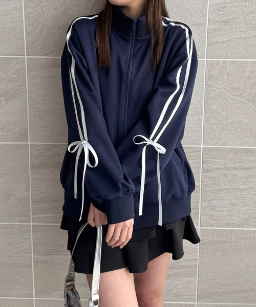 スポーティーな!サイドラインリボントラックジャケット【デザイン】トレンド感のあるリボンがほどこされたトラックジャケットです。程よくゆったりとしたシルエットで、抜け感のあるコーデに仕上がります!ジップを閉めていただくとハイネックになるので、防寒性も優れています♪【素材感】着心地の軽いポリエステル素材伸縮性:あり/ 透け感: なし/ 裏地:なし 手洗いによる洗濯可 / ドライ・ウェットクリーニング可【コーディネート】トップスとしてはもちろん、羽織りとしてもご着用いただけます♪ミニスカート合わせでガーリーコーデも、パンツ合わせでカジュアルコーデも◎【※お取り扱い上のご注意】1:モニター環境等により実際の商品と多少色味が異なって表示される場合がございます。予めご了承下さい。2:屋外で撮影された商品は、天候により多少実際のカラーと異なる場合があります。商品のカラーはトルソー(マネキン)の商品画像をご参照ください。3:濃い色の商品は、お洗濯や摩擦等による移染にご注意ください。4:末永くご愛用頂く為に、アテンションタグ・洗濯ネームを必ずご確認の上、着用又はお取り扱い下さい。5:生産時期により、色、サイズ、デザイン、素材の質感が多少が異なる場合がございます。あらかじめ御了承下さいませ。