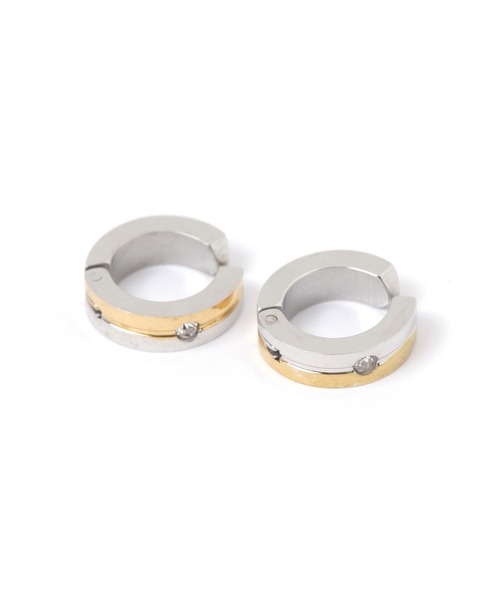 バイカラーが目を引くデザインのイヤリング。 シンプルなので、幅広いスタイリングに合わせやすいアイテムです。 さりげなくあしらったビジューもワンポイントになっています。 ステンレス素材は、水や汗に強く、付けっぱなしでもOKなのも嬉しいポイント。