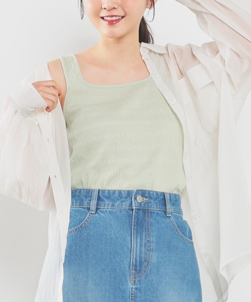 デイリーに大活躍♪ 【デザイン】 デコルテがすっきりきれいに見えるスクエアネックと、凹凸のある表面感がおしゃれなデザイン。 腰にかかる丈感。 【素材・機能】 ストレッチの利いた綿混ジャカード素材で、体にフィットしながら快適な着心地。 【スタイル】 シャツやシャツワンピを羽織りにしたスタイルやシアートップスとのレイヤードなどに、見せるインナーとして大活躍。 素材感で差を付けて、いつものスタイルも鮮度アップ◎ 品番:578-13-9415