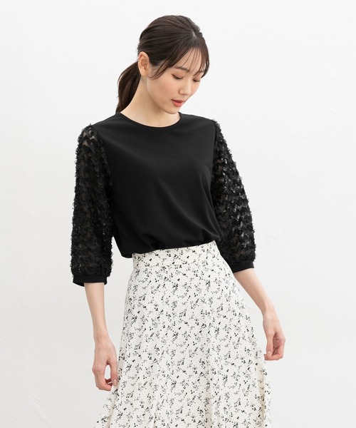 レース袖で上品に 【デザイン】 袖レースが華やかな、1枚でサマになるデザイン。 すっきりめの幅と腰にかかる丈感。 ひじまで隠れる袖丈で気になる二の腕もカバー。 【素材・機能】 身頃部分は、ストレッチの利いた、滑らかな表面感できれい見えするポンチ素材。 袖部分は、ほんのり透け感のある、上品なレース素材。 【スタイル】 フレアやマーメイドのスカートと合わせたフェミニンスタイルから、デニムと合わせたカジュアルスタイルまで、ボトムスを選ばす活躍。 ※6分袖 品番:579-11-9354