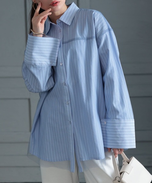 【アイテム】 明るいトーンが爽やかさを演出し、異素材使いが今っぽさ漂うスタイリングに仕上がる一枚。 シンプルなシャツに、ブロードチュールを重ねたデザインで、軽快さ漂うモードなスタイリングを演出。マニッシュな印象ながらも、チュールが重なることでレディな雰囲気をプラスします。袖口の大きなカフスがアクセントに。スリット入りで、そのままでも、折り曲げても着用でき、スタイリングに合わせて雰囲気を変えられます。 ゆったりとしたオーバーシャツだから、レイヤード時も窮屈感がなく、羽織りとしてもサマになるから、コーデの幅も広がります。シンプルな万能さが嬉しい無地デザインと、スタイリッシュさが際立つストライプ柄の2色展開。どちらもスタイリングしやすい大人モードなアイテムです。 【シーン】 お出かけ、旅行、ランチ、女子会、オフィスに活躍します。 【体型カバー】 ゆったりとしたシルエットで二の腕、ウエスト、ヒップの体型カバーができます。 ※お使いのディスプレイにより色味が異なって見える場合がございます。ご了承の上お買い求め下さい。 ※他のキャンペーンにより、期間中に価格が変動する場合があります。 ☆『お気に入り登録』でお得な情報がいっぱい☆ ■「商品のお気に入り登録」で再入荷通知や、在庫残り僅かの通知、セール通知も受け取ることができます。 ■「ブランドのお気に入り登録」で新商品や再入荷など、お得な情報を受け取ることができます! 是非ご登録くださいね☆
