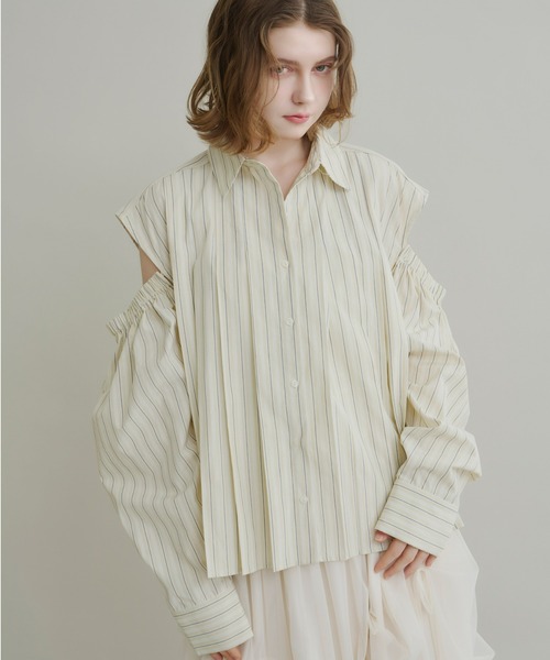 ショルダースリットがポイント!2wayストライプシャツ袖を取り外しても着られる万能2wayストライプシャツ。ヘルシーな肌見せが叶うショルダースリットがポイントです。袖を取り外すことで、フレンチスリーブのシャツとしても着用が可能です。カラーは、涼しげなライトブルーとふんわり柔らかなベージュの2色展開。胸元から裾に向けて入ったタックデザインが立体的なシルエットを作り、ふわっと軽やかなのに、着痩せして見えるシルエットが特徴です。スラックスはもちろん、Iラインスカートや、コンパクトなショートパンツに合わせていただくのもおすすめです。・色物と白物、淡色物は分けて洗ってください。・洗濯ネットを使用し、脱水後はすぐに干してください。・アイロンの際はあて布を使用してください。・摩擦や汗・雨などによって色移りする場合があります。