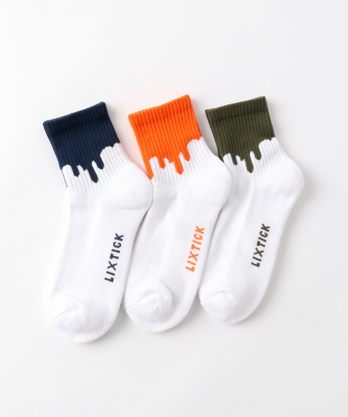 ※メーカー型番:DRIP SOCKS 3PACK 3RD LIXTICK DRIP SOCKS(リックスティックドリップソックス)は、肉厚の柔らかな履き心地、高品質な糸、カラーリング、そしてLIXTICKらしい遊び心を兼ね備えた定番3足組。 ただお洒落なだけではなく、履き心地にも妥協のない靴下は、靴に合わせて、気分に合わせて、飽きることなくローテーションできる。 さり気なく見え隠れするドリップはファッションのアクセントにもおすすめ。 伸縮性抜群で、23cm-28cm対応なので女性にも人気のドリップソックスです。 プレゼントやギフトに最適なドリップ柄パッケージ仕様。 【LIXTICK/リックスティック】 LIXTICKは企画から開発までこだわりを持った"トータルファッション雑貨"を展開し、なかでも日々の持ち物の軽量化、ポケットアート(日々持ち歩くことの出来るものにアートを取り入れる)に焦点を合わせた遊び心のあるライフスタイルを提案しています。 ※カラーについて 弊社販売カラー名:メーカーカラー名 ホワイト(010):NAVY,ORANGE,KHAKI ※サイズについて 弊社販売サイズ名:メーカーサイズ名 フリー(999):FREE ※照明の関係により、実際よりも色味が違って見える場合があります。 またパソコン・スマートフォンなどの環境により、若干製品と画像のカラーが異なる場合もございます。 ※商品の色味は、商品アップ画像をご参照ください。