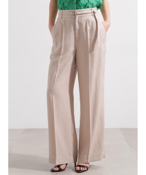 麻のような風合いの軽やかな素材を使用したワイドパンツハイウエストデザインと程よい太さのワイドシルエットで、スタイルアップ効果も抜群。センタープレスがすっきりとした印象を与えます。ウエストには細ベルトを施し、メタルバックルがアクセントに。単品でも幅広く活躍するアイテムですが、同素材のジャケット(031-5150416)と合わせれば、こなれ感のある洗練されたスタイルが完成します。 【素材説明】トリアセテートの仮撚りスラブ糸を使用し、麻のような糸節や麻かすを表現した麻調素材です。天然素材に近いムラ感があり、ナチュラルな表情を演出しています。ドライな質感でサラっとした肌触りが特徴です。 【商品特性】ストレッチ性なし/裏地付き/前ファスナーあき/後ろウエストゴム/ポケットX4/足首が隠れる丈◆お買い物をよりお楽しみいただくために◆・「商品のお気に入り登録」で完売カラーの再入荷やラスト1点、セール通知を受け取ことができます。・「ブランドのお気に入り登録」で新商品の入荷情報など、いち早く受け取ることができます。