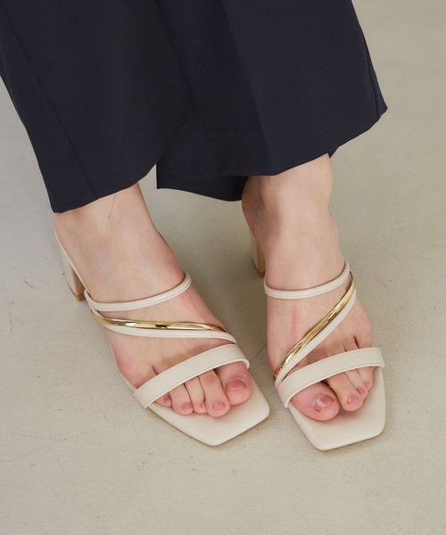 ◆2025春夏◆ 【デザイン・シルエット】 夏の足元にぴったりなナローアッパーにキラッとポイントを散りばめ、すっきりとしたスクエアトゥはスタイリングを引き締めてくれます。 斜めにクロスするラインが通ることで、しっかりと足をホールドしながらデザイン性も感じられる仕上がりです。 <POINT> ・斜めに通る曲線ラインはポイントになりながらも視覚的に足を女性らしく見せてくれます。 ・メタルプレートを目立ち過ぎないヒールの内側に仕込むことで歩く度にさりげなく足元を演出してくれます。 ・ヒールは接地面がしっかりとある形を採用し、見た目以上に安定感があります。 ・一番前のベルト裏には肌あたりが良い素材を取り付けています。 ・目の詰まったクッションを採用し、もちっとしたクッション感とヘタレにくい仕上がりです。 【素材】 サラっとした上品な合皮を採用。 【カラー】 ボトムを選ばないベーシックなブラックとオフホワイトの2色展開。メタリックラインはゴールド共通です。 【おすすめのスタイリング】 キレイ目なスタイリングはもちろん、デニムやクラフト調の足元にも合わせやすいです◎ ※画像の商品はサンプルです。 実際の商品と仕様、加工、サイズが若干異なる場合がございます。