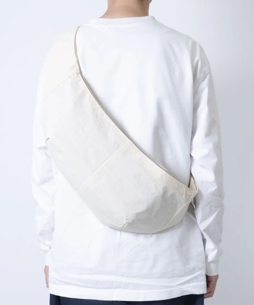カジュアルな質感の生地でワントーンに抑えたシンプルなデザインと、KONBU ®-N加工が施された本体生地による独特のハリやシワ感、マットな風合いが特徴が魅力のシリーズ。立体的なカッティングで見た目以上に収納力があり、前後胴共通のデザインになっていることで、利き腕に関係なく使用することができます。本体生地には、製造工程において発生した廃棄物を再利用したプレコンシューマ・リサイクルナイロン糸を平織りした生地に小松マテーレ(株)のKONBU ®-Nという特殊加工を施した素材を使用。自立するほどの硬度と引き裂きへの強度がありながら手に持ってみると驚くほどの軽さがあることが特徴です。付属レザーには1898 年創業のイタリア ミラノに所在する老舗タンナー「MONFRTNI PELLAMI S.R.L.(モンフリーニ ペラーミ)社」のクロムレザーを使用。プレーンなスムースレザーながら程よい光沢を醸し出した綺麗な表面が特徴です。Attention本体生地は加工によって、シワ感や白く見えるなど均一ではございません。また生地にハリ感があるため、使用時に多少の音が生じますが、生地の特性として予めご了承ください。付属に使用しているレザーは個体独特のシワや傷が入る場合がございます。 摩擦等による、色移行、変退色が生じる可能性がございますのでご注意ください。天然皮革の為、雨や水に濡れた場合はシミなどになる可能性がありますのでご注意ください。製品の仕様は予告なく変更する場合がありますのでご了承ください。