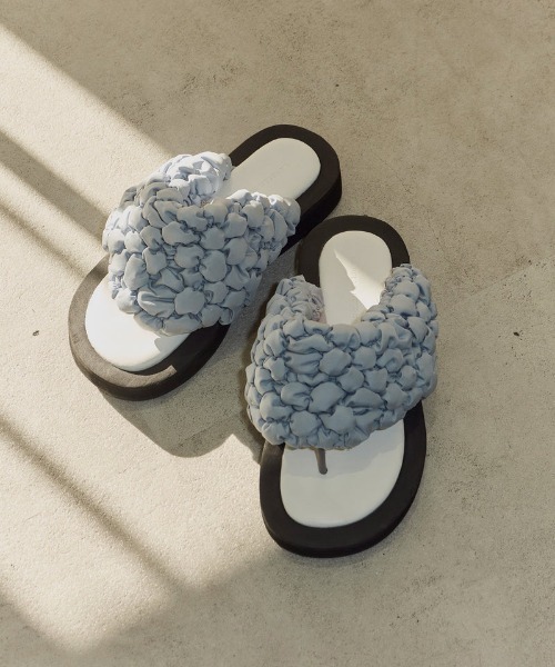 デコラティブなデザインが特徴的なサマーサンダル。 ▽デザインポイント ラフな印象を持つトングサンダル×ラバーソールの組み合わせに、 ボリュームたっぷりなポコポコ素材でアッパーを覆った目を惹く一足。 ポコポコの可愛らしい見た目ながら、モードなスタイリングにもおすすめ。 ▽ディティールポイント ポコポコと立体感のあるボリュームでアッパーをすっぽりと包み込み、 肌に当たる内側は、ポコポコの無いフラットな素材になっているので履き心地も◎ やや厚底でスタイルアップしつつ、 高すぎないヒールでデイリーユースにもぴったりです。 【サイズ補足】 甲幅 S:7.6cm / M:7.8cm / 8cm ■商品のお気に入り登録 再入荷の通知や、ラスト1点の通知、セールの通知がいち早く届きます! ■ブランドのお気に入り登録 新商品や再入荷など、いち早くブランドのお得情報が届きます!