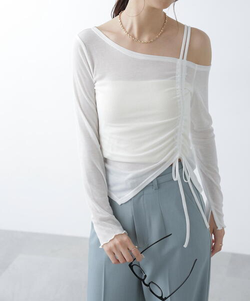 〔fabric&design〕 柔らかいタッチのシアーカットソー素材のカットソー。 ワンショルデザインで肩紐から前身頃までドロストデザインになっておりギャザーを寄せて立体的なデザインになります。 裾もアシメヘムでポイントに。 肌につかず離れずのコンパクトシルエットです。 袖口のスリットで抜け感をプラス。 〔stylinig〕 コンパクトなデザイントップスなのでワイドデニムでカジュアルな着こなしがおすすめ。 フェイクレザースカパン合わせで辛目スタイリングも◎ ■透け感:ややあり ■生地の厚さ:薄手 ■裏地:なし ■伸縮性:あり ■光沢:なし ■シルエット:スモール --------------------------------------------------- ◆商品のお気に入り登録◆ お気に入りアイテムの値下げ・再入荷・在庫1点などの通知を受け取ることができます。 ◆ブランドのお気に入り登録◆ 新商品や再入荷、セール、クーポン配布などお得な情報を受け取ることができます。 ---------------------------------------------------