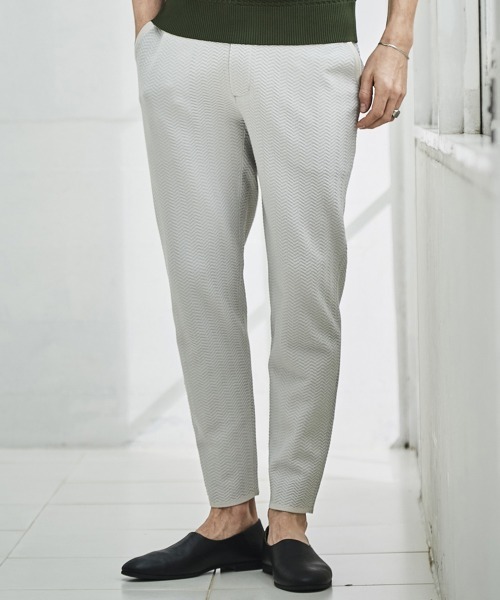 "大人が着る究極のシーンレスウェア""をコンセプトに作られたニットジャージのジャケットとパンツ"家⇔街、仕事⇔スポーツなど、1セットあれば、あらゆるシーンに着回せるのが魅力です。今季は、直営WEBショップ限定カラーに大振りのヘリンボーン柄のサマーニット生地を採用。リンクス+プレーティングの組み合わせで立体感のある配色編地。プレーティング編みで2色の糸を編み分け、ポケット口や袖先、裾周りにアクセントカラーを配し、さりげない洒落感を演出しています。更にリンクス+引き上げの組み合わせで立体感のあるハニカム調の編地は、顔立ちする表情豊かな仕上がりです。袖口やポケット口には、杢調の上品なリブでアクセントをプラスしています。軽量&ドライでソフトな質感のサマーニット生地は、ニット特有の膨らみ感ある面持。スタイルが単調にならないのが魅力です。1枚仕立て&ナチュラルショルダーの軽快な着心地を重視したライトな仕立てで、生地の凹凸による肌との接地面積を減らし、サラリとした快適な着用感を実現。パンツは腰回りにゆとりを持たせた快適な履き心地ながら、緩やかにテーパードを描く美脚シルエットで、ニットパンツでも品良い面持になるのがポイント。ウエストはドローコードとベルトループの2WAY仕様で、ON-OFF問わずに着回すことが可能です。素材の特性上シワにならず、保形成があるので小さくたたんで携帯でき、旅行や出張にも最適。快適な着心地なのに、”きちんと見え""するからテレワークなどの仕事シーンにも活躍します。ジャケットとパンツ共に家庭洗濯可能なので、デイリーにご着用いただけます。