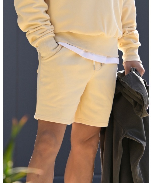 ■デザインポイント・シルエット ・裾部分にアプリケとブランドロゴ刺繍が施されたショーツ。 ・合わせやすく飽きのこないシンプルなデザイン。 ・ウエスト部分はリブ仕様になっており紐で調節可能。 ・同生地を使用したスウェットとセットアップでの着用もおすすめ。 ■素材・生地感 ・肌触りの良い綿と丈夫で速乾性の高いポリエステルを混紡させたしっかりとした生地感。 ・程よい厚みの裏起毛素材を採用し、ロングシーズン着用可能。
