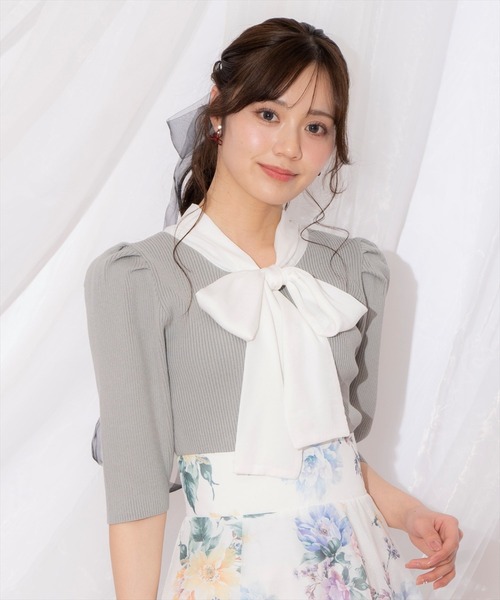 ニット×リボンタイのレイヤード風5分袖トップス【Design】・タックスリーブがフェミニンな雰囲気を演出するリボンタイプルオーバー。・袖丈はロングシーズン楽しめる5分袖丈。・ボウタイブラウスとレイヤードしたようなデザインなので、一枚で着映えるアイテムです♪・伸縮性のあるリブニットは肌触りもよく、ストレスフリーでご着用いただけます。・ニット×リボンタイの異素材MIXの表情感もポイント◎・リボンタイは取り外し不可。・被り仕様。・後ろ涙開きのボタン留め仕様。【Fabic】・伸縮性のあるリブニットを使用。・ご自宅でお手入れが出来るのも嬉しいポイント♪・エクリュ、ピンク、ミントの3色展開となります。【Care】手洗い可能F:(00):着丈50cm/身幅34cm/肩幅27cm/袖丈37cm/裾回り66cm