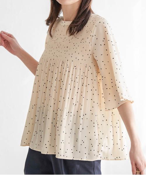 軽やかに揺れるプリーツと繊細な素材が特別感を引き立てるブラウス。 デニムやスカートと合わせることで、カジュアルにもフェミニンにも仕上がる一枚です。 【素材】 細かいシボ感のある薄手の合繊を使用。 価値観のあるマジョリカプリーツを施しています。 【デザイン】 Aラインに広がるシルエットが体形カバーにも◎ 上品見えのブラウスです。 【ikkaポイント】 ・身頃のマジョリカプリーツのかけ方をリニューアル。締め付け感も無くプリーツの伸縮性が着心地良く快適です。 ・二の腕をカバーするやや広がりのある袖は、ひじ下までの安心丈。 [洗濯方法]洗濯の際はネットを使用してください