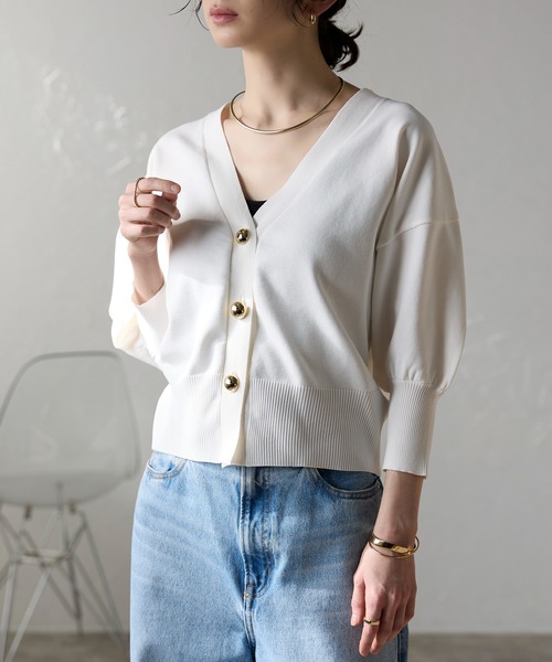 ゴールドボタンが目を惹くボリュームスリーブカーデ ■Detail ゴールドボタンが目を惹く季節の境目に重宝するカーディガン スポンディツシュニットを使用して程よいハリ感があり さらっと着用するだけできれいなシルエットを作れる1枚 深めのVネックでデコルテ周りを綺麗に見せて抜け感を演出 1枚で着用してコーディネートが完成します 使いやすいベーシックカラーとパキっとしたグリーンがさわやかな4色展開 ■Styling 少し短めのクロップド丈ながらボリューム感が出るシルエットなので 様々なボトムスと合わせて着用できます パンツ合わせ以外にもフレアスカートやワンピースと合わせるスタイリングもオススメです ■Material しっかりとした生地感でハリ感のあるスポンディッシュ素材です 裏地:なし 透け感:なし 伸縮性:あり 生地の厚さ:普通 ※詳しいお手入れ方法は商品タグをご参照ください。 ニット/スポンディッシュニット/カーディガン/Vネックカーディガン/ゴールドボタンカーディガン/ボリュームスリーブ/デイリー/高見え/ シンプル/着回し/春/夏/きれいめ/きれいめカジュアル/カジュアル/オトナカジュアル/大人カジュアル/高級感/華やか 【Information】 ◆《お気に入り登録》がオススメ◆ ・「商品のお気に入り登録」で再入荷通知や、ラストの通知、セール通知も受け取ることが出来ます。 ・「ブランドのお気に入り登録」で新商品や再入荷など、お得な情報を受け取ることが出来ます ※撮影時のライティング、ご覧になっているモニター・PC環境により、実際の商品と色味が異なって見える場合がございます。予めご了承をお願い致します。 ※ご注文いただいた予約商品のお届け時期の確認は、注文履歴ページより行えます。