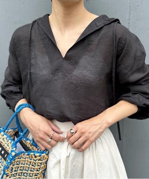 ■point(ポイント)透け感のある軽やかな素材で、羽織るだけでこなれた印象に。UV対策や冷房対策にもぴったりの、シーズンレスで使えるシアーパーカー。コンパクトに持ち運べて、春夏秋の着回しに活躍する1枚です。■detail(ディテール)程よいゆとりのあるシルエットで、インナーを選ばず重ね着しやすい。袖口と裾はリブ仕様で、バランスのとりやすいデザイン。ダブルジップタイプで、着こなしにアレンジを効かせられます。■fabric(素材感)シャリ感のあるシアー素材で、さらっと涼しい着心地。通気性に優れ、汗ばむ季節も快適に過ごせます。軽量でしわになりにくく、バッグに入れてもかさばらないのが嬉しいポイント。■coordinate(コーディネート)キャミやタンクの上に羽織って肌見せバランスを調整。ワンピースに重ねれば抜け感のあるスタイリングに。パンツにもスカートにも合わせやすく、デイリーから旅行まで幅広く活躍します。透け感が大人可愛いシアーパーカー。【M】着丈:66.7cm肩幅:55cmバスト:105cm袖丈:52cm袖口:10.5cm【L】着丈:68cm肩幅:58cmバスト:108cm袖丈:52cm袖口:11cm