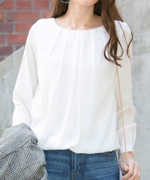フロントタックと裾バルーンが特徴の無地・ストライプのブラウス。 ふんわりとしたシルエットに透け感のある袖・バックスリットなど、 シンプルな中に女性らしいディテールが満載。 程良いきちんと感があるので、デイリーはもちろんオフィスでも大活躍の優秀アイテムです。※画像をご確認ください。