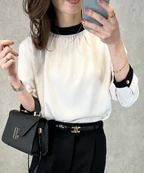 レトロで大人っぽい雰囲気を演出! バイカラーギャザーブラウス サラッとしたなめらかな肌触りのバイカラーギャザーブラウス。 首元のギャザーデザインが表情豊かなアクセントに。 深めのバックファスナーがついていて、着脱も楽なのが嬉しい。 デイリーからオフィスカジュアルまで着回し力も抜群です。 【S】着丈:61cm肩幅:34cmバスト:95cm袖丈:58cm袖口:18cm襟ぐり(周囲):約38cm【M】着丈:63cm肩幅:36cmバスト:99cm袖丈:58cm袖口:20cm襟ぐり(周囲):約38cm【L】着丈:65cm肩幅:38cmバスト:103cm袖丈:58cm袖口:22cm襟ぐり(周囲):約38cm【LL】着丈:67cm肩幅:40cmバスト:107cm袖丈:58cm袖口:24cm襟ぐり(周囲):約38cm