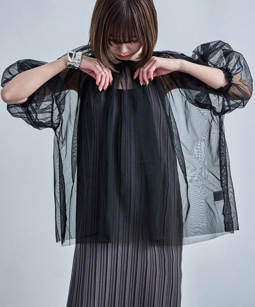 ふんわりとしたボリュームスリーブとシアー素材がフェミニンなブラウス。 たっぷりのギャザーとチュールでクラシカルかつ上品なコーデに。 ゆったりとしたシルエットでこなれ感もプラス。 ふんわり柔らかな生地感とキレイな落ち感で動くたびに美しいドレープを演出。 キャミやワンピに合わせるだけでオケージョンスタイルにも対応。 バックスタイルのリボンで後ろ姿も完璧。 【備考】 ・透け感あり ・袖口ゴム入り トップス / カットソー / シアートップス / オケージョン / パーティー / 韓国ファッション