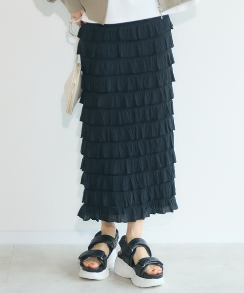 フリル×ナローシルエットで甘すぎない存在感のある着こなしが叶うスカート [素材] カットソー素材ならではの伸縮性で、一日中履いていてもストレスフリーな着用感。 [デザイン] ・フリルは段々に配して、スタイルアップのバランスが計算された1着。女性らしい柔らかな印象を与えてくれます。 ・フリルがアクセントになりながらも、全体のシルエットはIラインですっきりとしているので、甘くなりすぎず、カジュアルにもきれいめモードなスタイルにもマッチします。 ・ウエスト総ゴム仕様で着脱もラクチン。 [スタイリング] ・ブラウスを合わせてオフィススタイルに、Tシャツやプルオーバーを合わせてカジュアルダウンしたりと、幅広い着こなしをお楽しみいただけます。 ・足元はスニーカーで外したり、サンダルを合わせて軽やかで抜け感のあるスタイリングがおすすめです。足元のデザインによって、印象が大きく変わるのもポイント。 ■裏地:あり ■透け感:なし ■伸縮性:あり ■生地の厚さ:普通 ■ポケット:なし システムの都合上、店舗より入荷が遅れる場合がございます。 照明や光の当たり具合で色味が違って見える場合があります。 <25SS Collection 25Spring&Summer> 【お買い物をよりお楽しみいただくために】 ・商品のお気に入り登録をおすすめします! ♡マーククリックで登録できます。 完売カラーの再入荷や、ラスト1点になったときの通知、 セールの際に通知などお得な情報を受けることができます。 ・ブランドのお気に入り登録もご一緒にお願いいたします! 新商品や再入荷、などいち早くブランドの最新情報をお届けします。