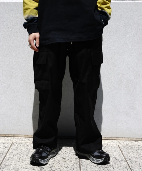 B omnivore/ビーオムニボー TR CARGO PANTSかなりワイドめなシルエットなカーゴパンツ。アメカジなスタイリングはもちろん、キレイめな雰囲気でも外しに使えて面白いアイテムです。ポリエステルとレーヨンを組み合わせたTR素材で、軽量でストレッチ性がありシワになりにくい特徴を持っています。【B omnivore/ビーオムニボー】omnivore=雑食系統に捉われず、様々なファッションスタイルとミックスして頂ける洋服を提案。