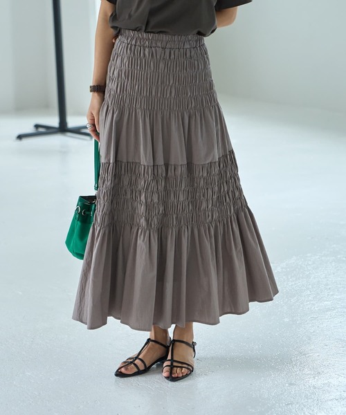 旬な全周シャーリング使いを取り入れた、デザイン性のあるフレアスカート。通常のギャザースカートとは異なり変則的な動きや独特のフォルムが出るところが特徴で、今っぽく新鮮なオシャレさが楽しめます。 シャーリング部分は言わばゴムなので、ラクな穿き心地と部分的な程よいフィット性もあるのがポイント。見た目よりもクセがなく、穿いてしまえば意外と簡単なのに、ファッション性の高さがあってハマってしまいそうな魅力があるスカートです。 ◆幅広のシャーリングを2か所に配したロングスカートです。シャーリング部分は良く伸び、サイズ的な心配がほとんどありません。7号から11号寄り9号体型の方まで幅広く対応できます。 ◆バスト位置まで引き上げて、ベアトップ型の膝下丈ワンピースとしても着用可能。それをチュニックのようにして、レギンス合わせコーデなども楽しむことができます。 ◆表面に控えめなシワ加工入り。コットン系の生地ですがポリエステルをブレンドすることにより、シワは気にならない感じになっています。 ◆もしもシワが気になる場合は、霧吹きでよく湿らせ、掛けておけばOKです。 ◆ミモレ丈程度の長さの裏地入り。薄くサラッとした、夏季も暑くない裏地です。 ◆ホワイトは裏地もホワイトですが、意外と透け感は気になりません。下着の色にもよりますが、それなりに響きづらいお色の下着を着ければ大丈夫です。 ◆Tシャツ合わせなどのカジュアルめなコーデはもちろん、ジャケット合わせなどのキレイめ通勤コーデにも使えます。 ◆合わせるシューズはとくに問わず、スニーカー合わせもOKです。 ◆トップスの裾はインでもアウトでも可愛く着用できます。脚の付け根程度のトップスを裾アウトで合わせるのがプロデューサーのお薦めです。 ◆腰張りや下腹が気になる方も、トップスの裾をアウトで合わせればとくに問題はないと思います。 ◆薄手でハリ感のあるコットン系素材。春夏メイン用の生地で、秋口まで(寒くなるまで)は着用できるイメージです。 【お知らせ事項】 こちらのスカートは生地加工の工程で、裏地の縫い目に収縮がかかり、縫い目付近の生地にヨレが生じます。多少の波々感といいますかヨレ感が出ますが、裏側なので着用に影響はなく、縫製不良ではありませんので予めご理解をお願いいたします。 【商品の特徴】 ◆着用時期:お好みで通年 ◆サイズ感:適度なゆとりのあるサイズ感 ◆丈感:足首が見える程度の丈感 ◆シルエット:フレアシルエット ◆ギャザー:切替部分にギャザーあり ◆スリット:なし ◆厚み:安心感のある厚み ◆柔らかさ:柔らかさの中にハリ感あり ◆着用ジワ:多少できる(気にならない程度。スチーマーでサッと伸ばせる扱いやす生地)。 ◆毛羽立ち:できにくい ◆伸縮性:なし ◆光沢感:なし ◆透け感:なし ◆ボタン:なし ◆ファスナー:なし ◆ポケット:なし ◆裏地:あり ◆手洗い:可能 ◆裾上げ:可能 ◆アイロン:可能(当て布使用。低アイロン) ◆ウエストゴム:ウエスト全周ゴム 【お色について】 ◆ブラック:通常の定番的なブラックです。 ◆ストーン:グレーとベージュを混ぜたようなニュアンスカラー。赤味やイエロー味は少ないお色です。 ◆ホワイト:優しく柔らかな肌馴染みの良いホワイト。クリーム色感はありません。 ※商品コメントの内容はブランドプロデューサーによる説明文です。