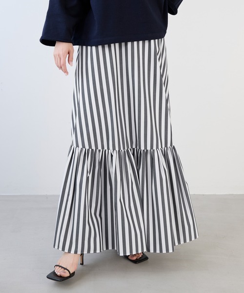 爽やかな印象を与えてくれるストライプ柄のスカート。たっぷりギャザーをあしらったボリューム感がポイントで、歩くたびに表情が生まれコーディネートが映える1枚です。ロゴTシャツやカットソーなどを合わせスカートを主役にしたコーディネートがおすすめ。ボリューミーな裾は体のラインを拾わず、レッグラインをカバーし、自分のサイズにフィットする後ろウエストゴム仕様で、楽な穿き心地です。 -------------------------------------- 透け感:なし 裏地:あり 伸縮性:なし 光沢感:なし 生地の厚さ:普通 -------------------------------------- 水洗い可 *詳しくは商品の洗濯表示にてご確認をお願い致します。 *商品画像はできる限り実物の色に近づけるよう徹底しておりますが、お使いのデバイスのモニター設定、お部屋の照明等の閲覧環境により実際の色味と異なって見える場合がございます。*画像の商品はサンプルです。実際の商品と仕様、加工が若干異なる場合があります。予めご了承くださいませ。 ▼商品のお気に入り登録 お気に入りアイテムの値下げ・再入荷・在庫1点などの通知を受け取ることができます。 ▼ブランドのお気に入り登録 新商品や再入荷、クーポン配布などのお得な情報を受け取ることができます。