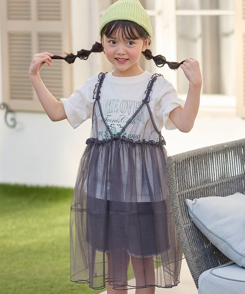 カジュアルなプリント T シャツと、フェミニンデザインのチュールワンピースがかわいいアンサンブル。トレンドのシアー素材を使ったコーデが完成します。チュールワンピースは肩紐と胸元の切り替しがギャザーになっており、女の子心をくすぐるキュートな1枚。それぞれ単体でも着用できるのでアレンジを楽しむのもおすすめ。インナーを変えれば年中活躍するアイテムです。【コーディネート】・【綿100%】タック コクーンデニムパンツ 品番:210505・【綿100%】フリンジデニムショートパンツ 品番:210529【生地の伸縮性】ワンピース:なし/インナー:ややあり【透け感】ワンピース:あり/インナー:オフややあり【裏地】なし【生地の厚み】ワンピース:薄手/インナー:ふつう※ご覧のモニター環境や撮影環境により実際の商品と多少色味が異なって見える場合がございます。●ブランド紹介●"ママも欲しいトレンドこども服"ファッション好きのママのためのトレンド感たっぷりのスタイル。レディーストレンドをこども服に落とし込んだデザインで、ママもキッズもいっしょに楽しめるファッションをご提案致します。【お気に入り登録がオススメ!】●商品のお気に入り登録「在庫残りわずか」の通知や、「完売カラーの再入荷」、「セール」の通知を受けることができます。●ブランドのお気に入り登録新商品や再入荷等、ブランドのお得な情報を受け取る事が出来ます。※他のキャンペーンにより、期間中に価格が変動する場合があります。※セールは予告なく終了させていただく場合もあります。※ご注文いただいた予約商品のお届け時期の確認は、注文履歴ページより行えます。