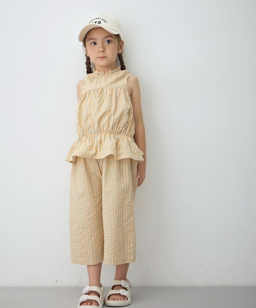 爽やかな配色のストライプが目を惹くセットアップが登場。 ノースリーブのティアードブラウスに、裾に向かって広がるゆったりとした7分丈パンツ。 涼しげなサッカー素材は、夏のお出かけにもおうち時間にもぴったりなアイテムです。 トップスは胸とウエストに2段のゴムギャザーが入ったデザインが唯一無二。 セットアップはもちろん、トップス、ボトムス単品で柄を主役にしたコーディネートを楽しむのもおすすめです。 【生地の伸縮性】 なし 【透け感】 ややあり 【裏地】 なし 【生地の厚み】 やや薄手 ※ご覧のモニター環境や撮影環境により実際の商品と多少色味が異なって見える場合がございます。 ●ブランド紹介● "ママも欲しいトレンドこども服" ファッション好きのママのためのトレンド感たっぷりのスタイル。 レディーストレンドをこども服に落とし込んだデザインで、 ママもキッズもいっしょに楽しめるファッションをご提案致します。 【お気に入り登録がオススメ!】 ●商品のお気に入り登録 「在庫残りわずか」の通知や、「完売カラーの再入荷」、「セール」の通知を受けることができます。 ●ブランドのお気に入り登録 新商品や再入荷等、ブランドのお得な情報を受け取る事が出来ます。 ※他のキャンペーンにより、期間中に価格が変動する場合があります。※セールは予告なく終了させていただく場合もあります。 ※ご注文いただいた予約商品のお届け時期の確認は、注文履歴ページより行えます。