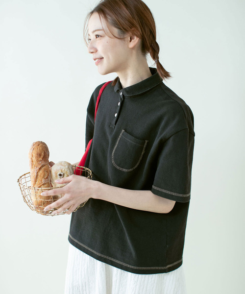 春夏の様々なスタイリングで活躍する、一枚は持っておきたいメンズライクなポロシャツ。 太番手の空紡糸を使用したドライタッチなカノコ素材は、シャリっと肌離れする着心地と程よくハリのあるシルエットで暑い時期にもぴったり。通常のカノコよりも凹凸のある表面感と、透け感を気にせず着られる厚みで、着込む度に味わい深い風合いに経年変化していきます。 台襟付きの小ぶりな襟とポケットはさりげなく丸みを持たせ、スポーティー過ぎずにお手持ちのアイテムに馴染むこだわりのデザイン。ベーシックな中に、配色のステッチ糸やお行儀よく並んだボタンのディテールが光ります。すっきりとしつつも身体に沿いすぎない絶妙なサイズ感。デニムやチノパンなどメンズライクなボトムとの相性はもちろん、スカートと合わせてキチンとした印象のスタイリングもおすすめです。 -------------------- 透け感:アイボリーのみややあり 裏地:なし 伸縮性:ややあり 光沢感:なし ポケット:あり -------------------- 【素材の特性・お取り扱いの注意】 ・取り扱いの注意については取り扱い表示をよくご確認の上、着用をお願い致します。 ・(ブラック)汗や雨等でぬれた場合、摩擦などにより色落ちし、他の衣料に移染することがありますのでご注意下さい。 ※撮影画像は、光の当たり具合やモニターの環境により色味が違って見える場合があります。あらかじめご了承下さい。 ※ブラックの着用画像はサンプルです。お届けする実際の商品と仕様、加工、サイズが若干異なる場合がございます。 サンプルの着用画像から前立てのボタン両端にステッチが入り、胸ポケット口の端にカンヌキが入ります。 ※アイボリーの実物に近い色味は詳細画像の一番後ろの生地寄り画像をご確認下さい。