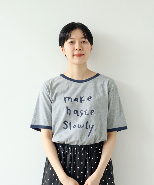 ゆるやかな手書きプリントが目を惹くリンガーTシャツ。 毛羽立ちが少なく、しなやかで優しい風合いのコーマ天竺を使用しました。襟と裾には配色のフライス生地を使用し、カジュアルでありながらもすっきりとした印象に。吸湿性・通気性に優れ、お手入れしやすいコットン100%のTシャツは暑い夏のスタイリングに欠かせないアイテムです。 手書き文字の “make haste slowly.” は “ゆっくり急ぐ”という意味のことわざ。せわしない日々でも力を抜きつつ、ひとつひとつを丁寧にというメッセージが込められています。着こなしに取り入れやすいベーシックカラーと他と被らない差し色でご用意しました。 程良く薄手で落ち感があり、ちょっぴり綺麗な印象ながらもラフに着られるので、メンズライクなアイテムと合わせるとこなれた印象に。デニムやチノパンツなどの王道ボトムと合わせてTシャツを主役にしたスタイリングがおすすめ。キャップやローファー、革小物をプラスしてトラッドな雰囲気にも。小花柄やドットスカートなど女性らしいアイテムとも相性抜群です。 -------------------- 透け感:ホワイトとグリーンのみややあり 裏地:なし 伸縮性:ややあり 光沢感:なし ポケット:なし -------------------- 【素材の特性・お取り扱いの注意】 ・取り扱いの注意については取り扱い表示をよくご確認の上、着用をお願い致します。 ・雨や洗濯時に、濡れた状態で他の衣類等に10分以上密着させると色移りする可能性がありますのでご注意下さい。 ・着用や洗濯を繰り返すことにより、プリントのひび割れや剥離が生じる事があります。取扱いの際には次の点にご注意下さい。 ●プリント部分への過度な摩擦は避けて下さい。 ●プリント部分は一度汚れが付くと取れにくいので汚さないようにして下さい。 ●必ず裏返して洗って下さい。 ※撮影画像は、光の当たり具合やモニターの環境により色味が違って見える場合があります。あらかじめご了承下さい。 ※アイボリーの着用画像はサンプルです。お届けする実際の商品と仕様、加工、サイズが若干異なる場合がございます。アイボリーのサンプルから襟ぐりの横あき幅が一周で1.5cm小さくなり、もう少し詰まって見えます。 ※グレーのみサイズブレがあり、着丈、身幅、袖丈のサイズ感が他のカラーと若干異なります。詳しくはアイテムサイズの欄をご参照下さい。