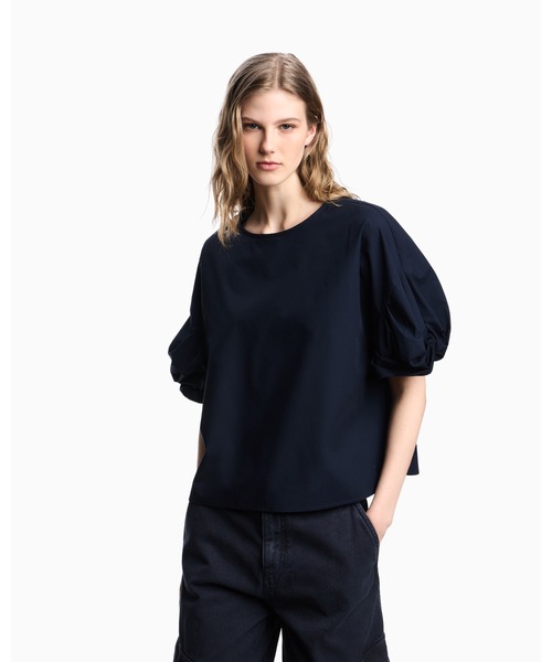 張りのあるピュアコットンのポプリンで仕立てたラウンドネックのブラウス。あらゆる装いに夏らしい雰囲気をプラスします。 幅広の七分袖が特徴的なボクシーフィットスタイル。 ツイストバルーンがフェミニンな魅力を引き立てます。 ポプリン / ラウンドネック / 幅広のツイストスリーブ / サイドスリット 【EMPORIO ARMANI ブランド紹介】 1981年にイタリア、ミラノで誕生。デザイナーはジョルジオ・アルマーニ。イタリア語でエンポリオとは「あらゆるものが手に入る大きな市場」という意味。着心地と自由な発想を大切にしながら、都会的で洗練されたアイテムを提案しています。 ※こちらはジョルジオ アルマーニ ジャパン株式会社の公式オンラインストアです。アフターサービスにつきましては、当サイト内サポートセンターへご連絡下さい。