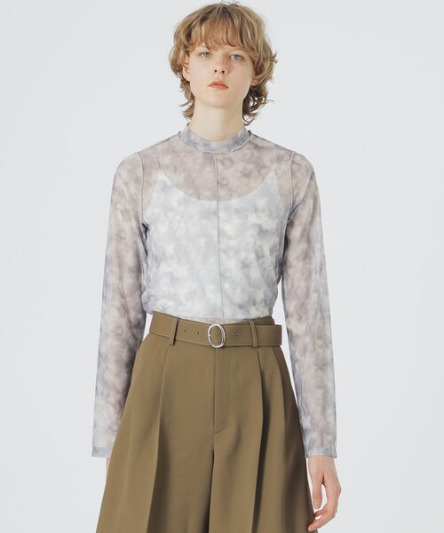 マーブル模様が印象的なシアー素材のトップス 【素材】 伸縮性のある細やかなメッシュ素材を使用。 ひっかかりの少ない滑らかな手触りが魅力の素材です。 【シルエット/デザイン】 程よく体にフィットするサイジング。 袖丈はやや長めの設計で、レイヤードスタイルにも最適 フロントにはメロー仕立てによる切り替えでアクセントを加えました。 【スタイリング/その他】 1枚での着用はもちろん、ジャケットやワンピースのインナーとしても幅広いスタイリングを楽しめます。 優れたストレッチ性で動きやすく、デイリー使いにぴったりな一着です。 【お手入れ方法】 こちらの商品は、おしゃれ着洗いでのお洗濯が可能です。 ━━━━━━━━━━━━━━━━━━━━━━━━━━ お買い物をお楽しみ頂くために <商品のお気に入り登録> 完売カラーの再入荷通知など、お得な情報をお届けします。 <注意事項> この商品はサンプルでの撮影を行っています。 実際の商品とイメージが異なる場合がございます。 撮影環境により、光の当たり具合で色味が違って見える場合があります。あらかじめご了承下さい。