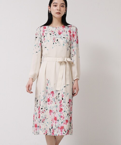 【デザイン】 八分袖丈のふんわりスリーブがフェミニンなパネルプリントワンピース。 顔周りとスカート部分に施した華やかなプリント柄がSunaUnaらしい印象です。 ウエストで切り替えが入っているので自然とフィット&フレアシルエットが表現でき、横から見た時にも細見えするシルエットです。 【素材】 光沢感のあるのバックサテンジョーゼット、多色の色使いの繊細な花柄をプリントしました。 ポリエステルを使用したSDG’Sな素材です。 *ミモザ:花言葉は「優雅」「友情」です。 ミモザの小さく丸い花がたくさん寄り集まって咲いている姿に由来します。 3月に人気の女性の幸せを象徴するお花です。 【着こなしポイント】 ウエストリボン付きなので、Aライン、フィット&フレア、2WAYでお楽しみいただけます。 【仕様】 ・ポケットなし ・後ろ中心ファスナー ・身頃裏付き ・共布ベルト付 ※こちらの商品はやや透け感があります。 ※照明の関係により、実際よりも色味が違って見える場合があります。また、パソコン・スマートフォンなどの環境により、若干製品と画像のカラーが異なる場合もございます。 モデル情報:身長168cm B81 W60 H89 着用サイズ:38(M) 店舗へのお問い合わせ商品番号:K92-52301 ●製品寸法: 34(SS):着丈101cm B87cm 袖丈51cm 肩幅36cm W72cm H98cm 36(S):着丈104cm B90cm 袖丈52cm 肩幅36cm W75cm H101cm 38(M):着丈105cm B93cm 袖丈53cm 肩幅37cm W78cm H104cm 40(L):着丈108cm B96cm 袖丈53cm 肩幅38cm W81cm H107cm 備考:
