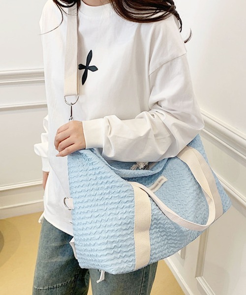 ★★2WAY用ショルダーストラップ入り◎★★ 【軽量・撥水加工】 【ぷくぷく凹凸感がかわいい♪】 大人気、ふくれジャガード配色ボストンバッグ/トラベルバッグ。 ぽわぽわとした特殊な生地をパステルカラーでまとめた大人キュートなボストンバッグ。 かわいい見た目ながらしっかり水を弾いてくれる撥水機能付き! 着脱式のショルダー紐が付属されているので、肩掛け~斜め掛けと2WAY・3WAYでお使いいただけます。 1way-手持ちボストンバッグ 2way-肩掛けショルダーバッグ 3way-斜め掛けジムバッグ A4資料やノートPCはもちろん、衣類やタオルなどもしっかり入る大容量♪ キャリーオンベルト付きなので、キャリーケースの上に乗せてもズレずに快適な移動が可能です。 きれいめワンピースやカジュアルなデニムコーデなど、どんな服にも合わせやすいおしゃれなアイテムに仕上げました。 [仕様] ・メイン口:ダブルジップ開閉 ・内側:小物ポケット×2、防水防湿ファスナーポケット中×1 ・体側:キャリーオンベルト(ファスナーポケット×1内蔵) ・付属品:着脱式&長さ調節可能なショルダー紐 [サイズ/重さ] 高さ35cm/下横幅46cm/上横幅53cm/奥行(底マチ)18cm/持ち手高さ20cm/ショルダー紐長さ最長105cm 430g [素材] ポリエステル おすすめのシーン 通勤 オフィス 通学 デート ディナー オケージョン フォーマル サブバッグ、旅行、レジャーなど幅広くお使いいただけます。 クリスマスやお誕生日などのプレゼントやギフトなどにも最適な仕上がりです。 ▼ブランド 【florge】 -フロージュ- 「着る人の心や体を癒し包む服、何気ない日常をちょっとだけ特別な日に変えられるアクセサリー」をテーマに、おしゃれでかわいい商品からおとなめオフィスに使える商品までトレンドの人気アイテムをご提案するレディースブランドです。 プチプラ商品を多く取り扱っているのも嬉しいポイント♪ 画像付近のブランド名からぜひご覧ください。