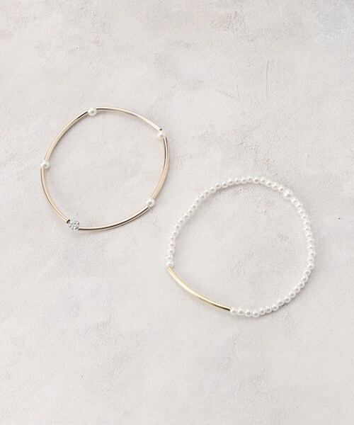メタルとパール調のパーツを組み合わせたブレスレット。【デザイン】小粒なパール調とメタルのパーツを組み合わせたゴムブレスレット。それぞれ1本ずつ使えるので、スタイリングに合わせて付け替えも楽しんでいただけます。清楚なイメージのパール調アイテムは、結婚式や卒業式・入学式などのオケージョンシーンやパーティーシーンはもちろん、カジュアルな普段使いまで、ファッションを選ばずお使いいただけます。※照明の関係により、実際よりも色味が違って見える場合があります。また、パソコン・スマートフォンなどの環境により、若干製品と画像のカラーが異なる場合もございます。店舗へのお問い合わせ商品番号:769-82048●製品寸法:00:内周16.5cm 幅0.2cm備考: