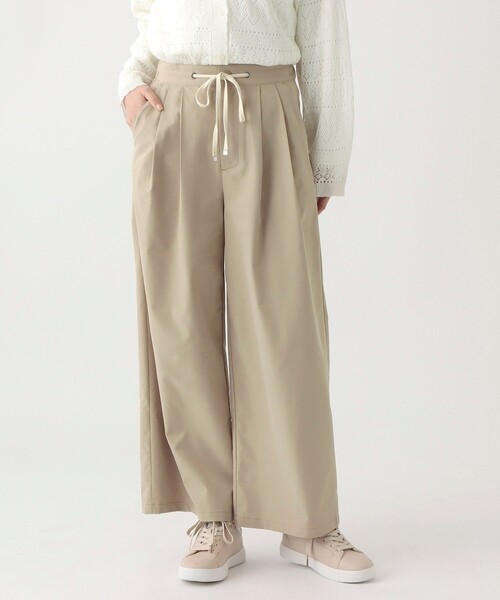 シンプルな無地デザインで着まわしやすいワイドパンツです。 センターにツータックを施し、腰まわりにゆとりを持たせました。ボリュームがありながらも自然なドレープで縦長に見えるのもポイントです。ヒップラインがすっきり見えるように、ポケット部分をスリット仕立てにしました。ウエストゴムで窮屈せず、紐を絞ればお好みのフィット感で着用できます。あえてトップスをインして、配色の紐を見せるのもおすすめ。グラフィックTシャツとのカジュアルなスタイリングから、カーディガンとのきれいめなテイストまで幅広い着こなしが楽しめますよ。 濃色製品は色落ちしますので他のものと分けて洗濯してください。洗濯前のつけ置きや濡れたままで長時間放置しないでください。 洗濯の際はネットを使用してください。 アイロンを掛ける際はあて布を使用してください。