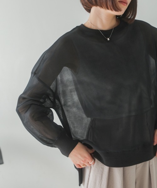 ■POINT トレンド素材のシアー感のあるダンボール素材を使ったプルオーバー。ほんのりとした透け感なので、気軽に着ることができるアイテムです。あえてのカラーのインナーを透けさせたり、長袖やタンクトップなどインナーで表情を変えられるので、アレンジを楽しんで頂けます♪袖を立体的に見せるように切替とタックを入れているので、すっきりとしていながらも袖ボリューム感で着痩せして見せてくれます。 ■FABRIC ダンボール素材といって、ふんわり感のある素材なので着ると立体感が出るので、自然とコナレタ印象に仕上がる素材感。 ………………… 透け感:あり 裏地:なし ………………… ★商品のお気に入り登録 登録すると、完売しても再入荷時に通知を受け取ることができます。 ほかにもお得な特典があるかもしれません♪ ★ブランドのお気に入り登録 新商品や再入荷などの情報を受け取ることができますので、是非ご登録ください♪