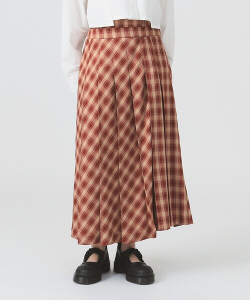 トレンド感あふれるコーデが完成■デザインクラシックなチェック柄のプリーツスカート。 ベーシックなプリーツデザインに、左脇と中央部分に異なる柄の配置を施し、スタイリングの主役となる1着に仕上げました。■コーディネートカットソーやスウェットなどとのカジュアルなコーディネートはもちろん、 ジャケットやシャツ、ブラウスとのきれいめスタイルにもぴったりな、着回し力の高いアイテムです。■ディテールウエストには、トレンド感漂うダブルウエストディテールを取り入れています。■サイズウエストはあえてリラックス感のあるゆったりとしたサイズ感に仕上げており、ローライズで着るのがおすすめです。■素材ポリエステル素材の滑らかな肌触りで、清涼感があり軽やか。春夏にぴったりな一枚です。■ケア方法ドライクリーニング(詳細は商品についている洗濯表示タグをご覧ください。)【WHITE/BLACK】BEAMS STAFF:H163 Size:(画像の商品はサンプル用サイズのため実際のサイズ感と異なります)【BROWN】BEAMS STAFF:H164 Size:(画像の商品はサンプル用サイズのため実際のサイズ感と異なります)生地の厚さ:やや薄手透け感:なし伸縮性:なし光沢感:ややあり裏地:あり【スタッフレビュー】スタッフ:haru身長:152cm / 普段サイズ:0 / 着用サイズ:1サイズ感: 腰回りはすっきりとしたサイズ感。素材感: 薄手で張り感があります。透けは気になりません。ポイント: マドラスチェックとフレアなシルエットがかわいいです。オーバーサイズのトップスを合わせるのも◎※光の当たり具合やパソコンなどの閲覧環境によって、実際の色味と異なって見える場合がございます。予めご了承ください。※商品の色味は商品単体で撮影した画像をご参照ください。