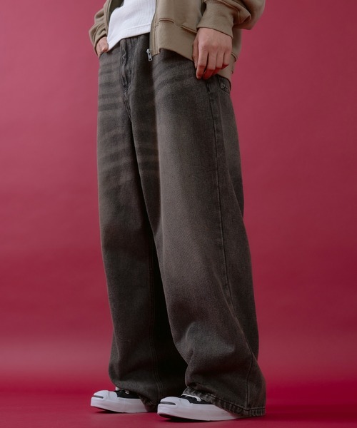 程よいウォッシュ感とビンテージ感に目を引くデニムバギーパンツ。 ●伸縮性のある着心地の良いデニム素材を使用 ●自然なアタリや色落ち感など、ヴィンテージライクな風合い。 ●ゆったりとしたワイドシルエットのバギーパンツ トレーナーやパーカーと合わせたストリート、スケーター、韓国ファッションと相性がよく 男女問わずユニセックスにお勧めしたいアイテムです。