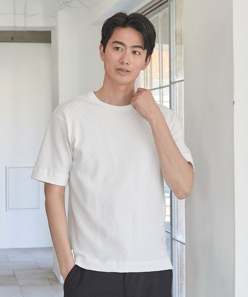毎回大人気の準定番アイテム『シェブロン柄リンクスジャガードTシャツ』 洗練された素材感と程良くゆとりのあるシルエットが毎回大好評のTシャツです。 ドライタッチ素材を使用しているので、シーズンを通して快適な着用感。 大人のリラックス感を演出してくれる人気の1枚です。 【デザイン】 ドライタッチで表面感のあるジグザグパターンが特徴のリンクスジャガード素材を使用。 シンプルな無地Tシャツとは一線を画する織柄は高級感があります。 両サイド裾部分のスリットもオシャレなポイントです。 【スタイリング】 キレイ目なTシャツは一枚着でもきちんと感があり、ジャケットスタイルとも相性が良く、 春先は一枚着としても様になり、インナーとしても活躍するので3シーズン着用いただけます。 【UNIONSTATION/ユニオンステーション】 「さりげない上品さ」をキーワードに大人に向けた、素材感と着心地にこだわったアイテムを展開。 肩ひじを張らずに自分に合ったおしゃれを楽しめる、きれいめスタイルを提案します。 私たちは服を通してみなさまの心が明るくなったりワクワクしたり、ささやかな高揚感を感じていただけるような”おしゃれ着”をお届けします。