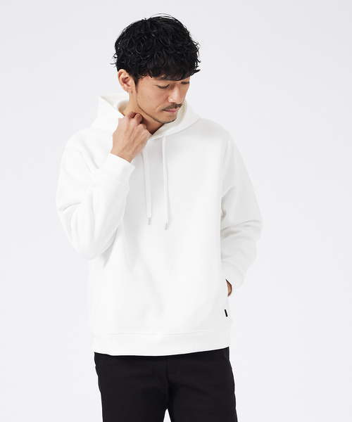 【素材】ポリエステル特有の速乾性とナイロン特有の強度を併せ持ったユーティリティ素材を使用。 膨らみのあるきれい目なダンボール素材の表面に凹凸感あるツイル柄を施しました。 【デザイン】 ゆとりあるシルエットとキックバック性に優れた素材により体のラインを拾いにくいようデザインされている為、体型が気になる大人の男性にも安心して着用していただけます。 ラフな印象のスウェットを、上品なツイル柄や裾口の控えめなピスネームが綺麗目な印象を与えクールでエレガントな雰囲気を演出してくれます。さりげなくスリットポケットが付いているのも嬉しいポイントです。 【コーディネート】 きれいめなカジュアルスタイルはもちろん、ストレッチ&速乾性もあるので スポーツやレジャーといったアクティブなシーン着用いただけます。 同素材クルーネック(71509720000)もおすすめです。 ホワイト モデル:H180 B93 W76 H94 着用サイズ:48 グレージュ モデル:H180 B93 W76 H94 着用サイズ:48 チャコールグレー モデル:H180 B93 W76 H94 着用サイズ:48