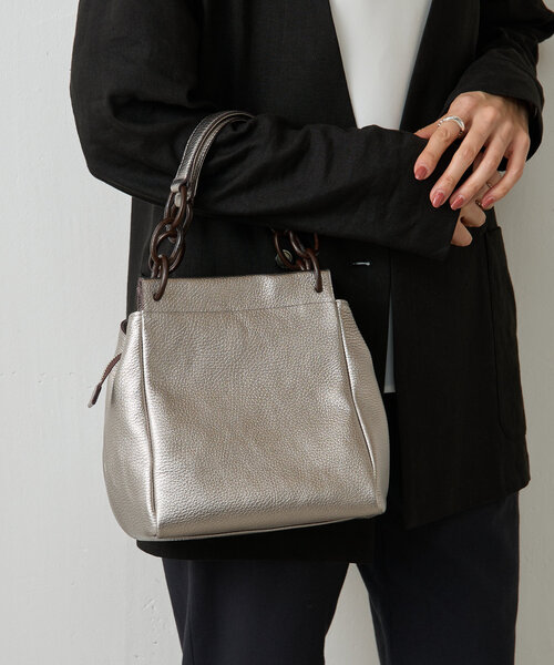 ■アイテム都会的な洗練を纏う、上質なレザーチェーンバッグ。メタリックなチェーン付きのハンドルはシンプルながらも存在感があり、アクセントに。どんなスタイルにも合わせやすくデイリーユースからフォーマルなシーンまで幅広く活躍するデザインです。シボ感のあるレザーは、上品な光沢を放ち、高級感を演出。コンパクトながらも、必要な物をしっかり収納できるサイズ感で、使いやすさも抜群です。■素材本体:牛革裏地:マイクロスエード※着用時は、必ず取扱い表示・タグをご確認の上、お取り扱い下さい。《予約商品について》・サンプルの為、素材情報については企画段階の情報を記載しております。公的機関での試験データ結果を受け、量産にあたり混率の変更が発生する場合がございますので、ご了承くださいませ。・サンプルでの撮影、計測をしております。商品の仕様が一部変更になる場合がございます。・撮影サンプル品はブランドタグがついておりません。製品にはタグがつきますので、製品の表に縫い糸が見える場合がございます。・工場の生産の都合上、納期が変更になる場合がございます。検品や輸送の関係で、発送日が前後しますのでご了承ください。また、入荷状況により、お客様への発送が店頭販売より遅れる場合もございます。・店頭に陳列していた商品も含まれる場合がございます。《商品画像について》ご覧頂いている商品の写真につきましては、できるだけ実物の色に近くなるように努めておりますが お使いの環境(モニター、ブラウザ等)の違いにより、色の見え方が実物と若干異なる場合がございます。 予めご了承ください。《ハートをタップして商品のお気に入り登録》登録カラーの商品の「残りわずか」「再入荷」「値下げ」通知を受け取ることができます。各ショップアプリにてブランドフォロー 新商品などの入荷情報、最新のニュースやお得な情報を受け取ることができます。