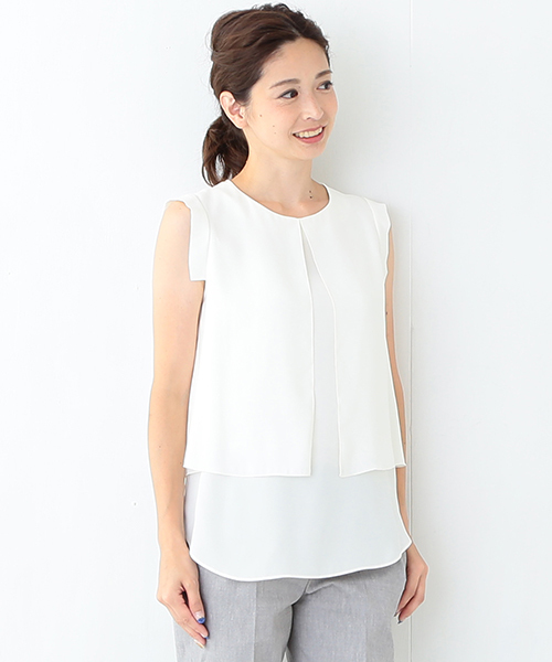 レイヤード風のデザインがハンサムな印象のブラウスです。袖口のデザインは、モードな雰囲気を漂わすだけでなく、気になる腕周りをさりげなくカバーしてくれます。柔らかで繊細なバックサテンジョーゼットは、動くたびにしなやかに揺れる素材。一枚で着るのはもちろん、ジャケットやカーディガンを重ねても地味に見えない優秀トップスです。 オフホワイトModel : 160(cm) Size : ONE SIZE ミントModel : 154(cm) Size : ONE SIZE 店舗へお問い合わせの際は下記品番をお伝えください。品番:68-01-0132-002
