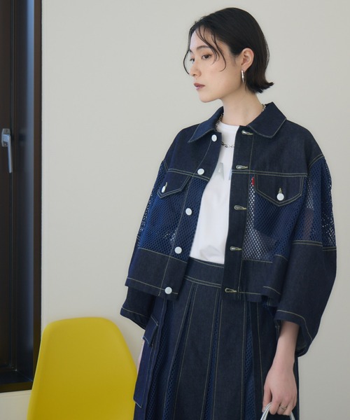 異素材MIXで魅せる、大人のモードジャケット <POINT> デニム×メッシュのドッキングデザインでこなれ感アップ。 立体的なボリューム袖が華やかさを演出。 背中の透け感が抜け感をプラスし、涼しげな印象に。 後ろはプリーツ入り&丈長めで、さりげなく体型カバーも。 配色ステッチがアクセントになり、スタイリングを引き締める。 【デザイン・シルエット】 デニムのカジュアルな雰囲気と、メッシュの軽やかさを組み合わせた異素材ジャケット。 立体的に裁断されたボリューム袖がモード感を引き立て、存在感のあるシルエットに。 背中には大胆にメッシュ素材を使用し、抜け感と涼しさをプラス。 後ろに施されたプリーツが動くたびに揺れ、華やかで女性らしい印象を与えます。 ヒップを半分隠す丈感で、バランスよくスタイルアップも叶います。 【素材感】 デニム部分は厚手でしっかりとした生地感ながら、柔らかく着心地の良い仕上がり。 背中のメッシュ素材は目が粗く、軽やかで通気性抜群。 異素材のコントラストが洗練された雰囲気を演出します。 【カラー】 ブルー(1色展開) 【スタイリング】 シンプルなインナーとデニムパンツを合わせれば、ラフでこなれ感のある大人カジュアルに。 ワイドパンツやスラックスと合わせれば、よりモードな印象に仕上がります。 ショート丈のボトムスやワンピースと合わせて、抜け感のある軽やかなスタイルもおすすめ。 【ディテール】 裏地: なし 光沢: なし 伸縮性: なし 透け感: あり(背中メッシュ部分) 生地の厚さ: デニム部分は厚手 ポケット: あり 【USU GALLERY(ユーエスユーギャラリー)】 不変的なミリタリー・ワークウェアをオマージュしつつ、独自のデザイン性を加えて変化させてきたブランド。 ※照明の都合上、多少の色ブレが生じてしまう可能性がございますので、予めご了承くださいますようお願い致します。 --------------------------------------------------- ●お気に入り登録でお得情報を手に入れよう! 「商品のお気に入り登録」をすると、再入荷通知や、ラスト1点の通知、セールの通知など、お得情報が届きます。 また、マイページでいつでも確認が可能になります。 「ブランドのお気に入り登録」をすると、新商品や再入荷、などいち早くブランドの最新情報をお届けします。 ぜひ、ご利用ください。 ----------------------------------------------------