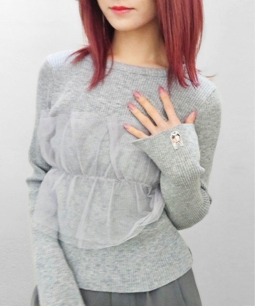 チュールドッキングニット【Tulle Docking Knit】セールス・リブニット×チュールで華やかな印象・スリット袖にヒッピーワッペンが可愛い・厚すぎないほどよいニット素材・春アウターと相性抜群・暖かくなったらトップスでコーデも◎