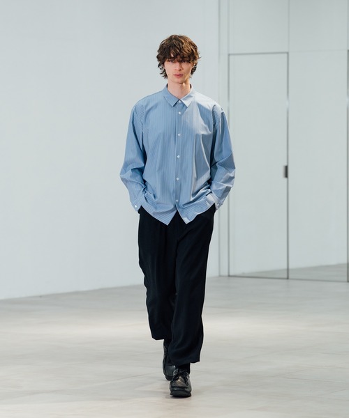 <素材> 1943年に石川県で創業の小松マテーレ株式会社。極秘のレシピで彼らにしか出来ない特殊染色・加工技術を得意とする 国内有数の合成繊維メーカー。落ち感と反発力を併せ持つポリエステルの二重組織で、表情のあるクレープ状の表面感。 更に特殊加工によるナチュラルなシワ感を加え、合成繊維でありながら天然繊維の様なナチュラルな表情が最大の特徴。 ①ウォッシャブル。 パンツ試し洗い。家庭洗濯機にて単品洗いでは無く30分(脱水6分)。気温16度晴、日当たりの良い場所で吊るし干し、 約一時間で乾燥。ノーアイロンでOK。 ?ジャケット&シャツジャケットはラベル部分にアイロン必要。 ②防シワ。 パンツ試し穿き。夕方〜夜〜朝まで。朝起きてほぼシワ無し。 ③肌触りの良さ。 表は凹凸感のあるラフな印象。裏はサテン目でシルクの様な気持ち良さとひんやりと感じるクールさ。 ④2WAYストレッチ。 リラックスしたサイズ感ながらのあるある、素材が突っ張って引っ掛かる。特にパンツ。この素材は十分に伸びがあり、更に裏面の滑りの良さもある為より快適に。 ⑤耐久性。 ピリング4.5級、10時間試験(MAX5級)。スナッグ(ひっかかり)4級(MAX5級)。凹凸感のある表面に対して高いデータ基準。 ?必ずならない訳では無く、擦れる材質や鋭角さ、10時間以上、経年変化などでなる可能性も。 <デザイン> 丸みを帯びたワイドテーパードシルエット。ストレスの無いウエストゴム&コードのイージー仕様、フロント2タック、 素材の落ち感を活かした体形を選ばないシルエットが最大の特徴。丈感もウエスト位置を調整する事で自由自在に。 イージーパンツと言えども、上品な素材感から革靴でもスニーカーでもはまる万能選手。 泳ぐ素材感・裏面の滑らかさで、夏場の時期でも楽になおかつ上品に穿けるアイテム。 *前シーズンより変更無し。