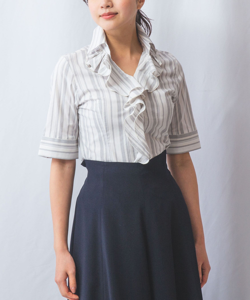 さりげないラメ糸をMIXした上品なランダムラメストライプ半袖シャツ。襟付きでフリルをあしらった定番の人気デザイン。生地はストレッチがきいており、着心地も抜群です。五分袖にすることで気になる腕周りもカバー。1枚で華やかに見えるシャツは、フォーマルやオケージョンなどの様々なシーンにも活躍してくれます。・多少透け感あり・ストレッチあり・カラー展開はブラック、レッド、ブルー・サイズ展開は0(S)7号・1(M)9号・2(L)11号・3(2L)13号・4(3L)15号・5(4L)17号