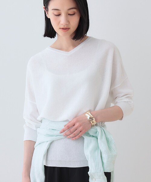 【デザインポイント】コットンとリネン混の光沢感のある綺麗めな見え感とタッチが特徴のシンプルなドルマン型トップスです。身体から離れトレンド感あるフォルムですが、程よい落ち感があります。袖丈は短く程よいスッキリしたデザインで、インナー見えを防ぎつつメリハリのあるシルエット感に仕上げています。浅めのVネックラインでデコルテを華奢にきれいに見せてくれます。【スタイリングポイント】褒められパンツのタックテーパードなどの細身のボトムはもちろん、落ち感や艶感のあるワイドパンツ合わせが今っぽくこなれ感も出ておすすめです。スカートならIラインシルエット合わせがバランス良くメリハリも付きおすすめです。【素材ポイント】コットンにリネンとラミーを混紡したストレートヤーンに、光沢感のあるポリエステルフィラメントをカバーリングしています。麻のドライでナチュラルな質感にポリエステルの光沢感が合わさることにより、独自の表情が生み出されています。また、ポリエステルフィラメントのカバーリングにより、麻の毛羽感も防いでいます。※照明の関係により、実際よりも色味が違って見える場合があります。また、パソコン・スマートフォンなどの環境により、若干製品と画像のカラーが異なる場合もございます。【生地詳細】透け感:ややあり伸縮性:ややあり生地の厚み:普通裏地:なし洗濯方法:手洗い可オフ率50%以上モデル情報:身長171cm B80 W58 H86 着用サイズ:38(M)店舗へのお問い合わせ商品番号:127-12450●製品寸法:05(XXS):着丈58cm B116cm 袖丈22cm 肩幅63cm13(LL):着丈65cm B134cm 袖丈26cm 肩幅72cm15(3L):着丈66cm B140cm 袖丈26cm 肩幅75cm34(S):着丈62cm B122cm 袖丈27cm 肩幅63cm38(M):着丈63cm B128cm 袖丈26cm 肩幅66cm備考: