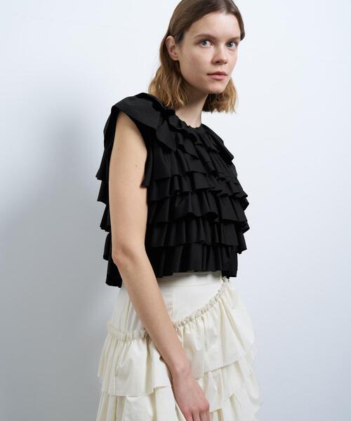 ◇デザイン全体にあしらわれたフリルが存在感ある1着。裁ち切りのフリルが軽やかな印象で、アシンメトリーな重なり方もLANVINのエッセンスを感じられるアイテムです。こだわりがつまったフリルは、1枚1枚丁寧に縫い付け、仕上げられています。LANVIN en Bleuならではの特別感あるアイテムです。◇ファブリックとても細い糸を使用してハイゲージで編立てられたスムースを使用しています。シルケット加工で余分な毛羽を取り除き、きれいな表面感とツヤを出しています。オレンジはLANVIN en Bleuのオリジナルカラー。------------------------------裏地:なし光沢感:なし伸縮性:なし生地の厚さ:普通透け:なし重さ:ふつうポケット:なし洗濯:ドライ------------------------------◇コーディネートコンパクトなサイズ感にすることで、スタイリングもしやすいバランス。◆商品画像はサンプルのため、デザイン、素材(混率等)、色味やサイズなどの仕様に変更がある場合がございますので予めご了承くださいませ。modelオフ:H176 B74 W58 H88 着用サイズ:38オレンジ/ブラック:H175 B78 W60 H89 着用サイズ:38※定価(税込)は、2025年6月27日のセール開始前の店舗における販売価格です。