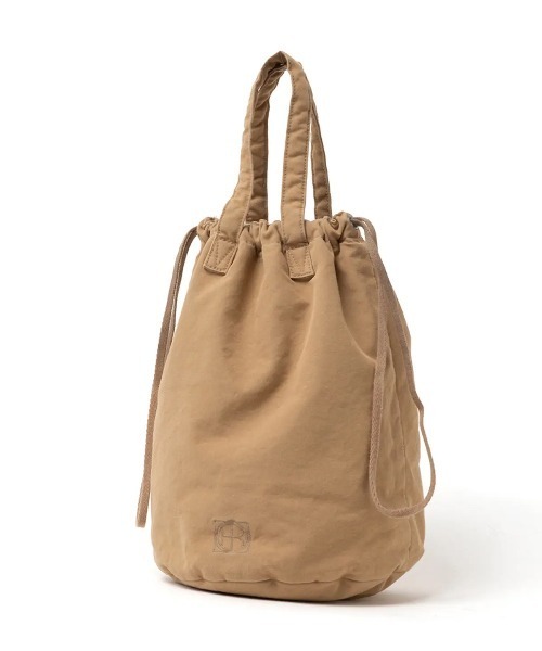 両サイドのコードを絞るとボディ全体が錐形になるドローストリングポーチのMサイズ。ボディとハンドルに中綿が入ることでシルエットとクッション性が保たれ、持ちやすさも兼ね備えています。ハンドル内側にポケットとドリンクホルダーが備わり、荷物の管理もしやすいつくりになっています。高密度に織り上げられた軽量コットンキャンバス素材を使用しています。強度が高く、耐久性、耐摩耗性に優れており、光沢を抑えたマットな質感が特徴です。W19.5×H32×D19.5cm 12L